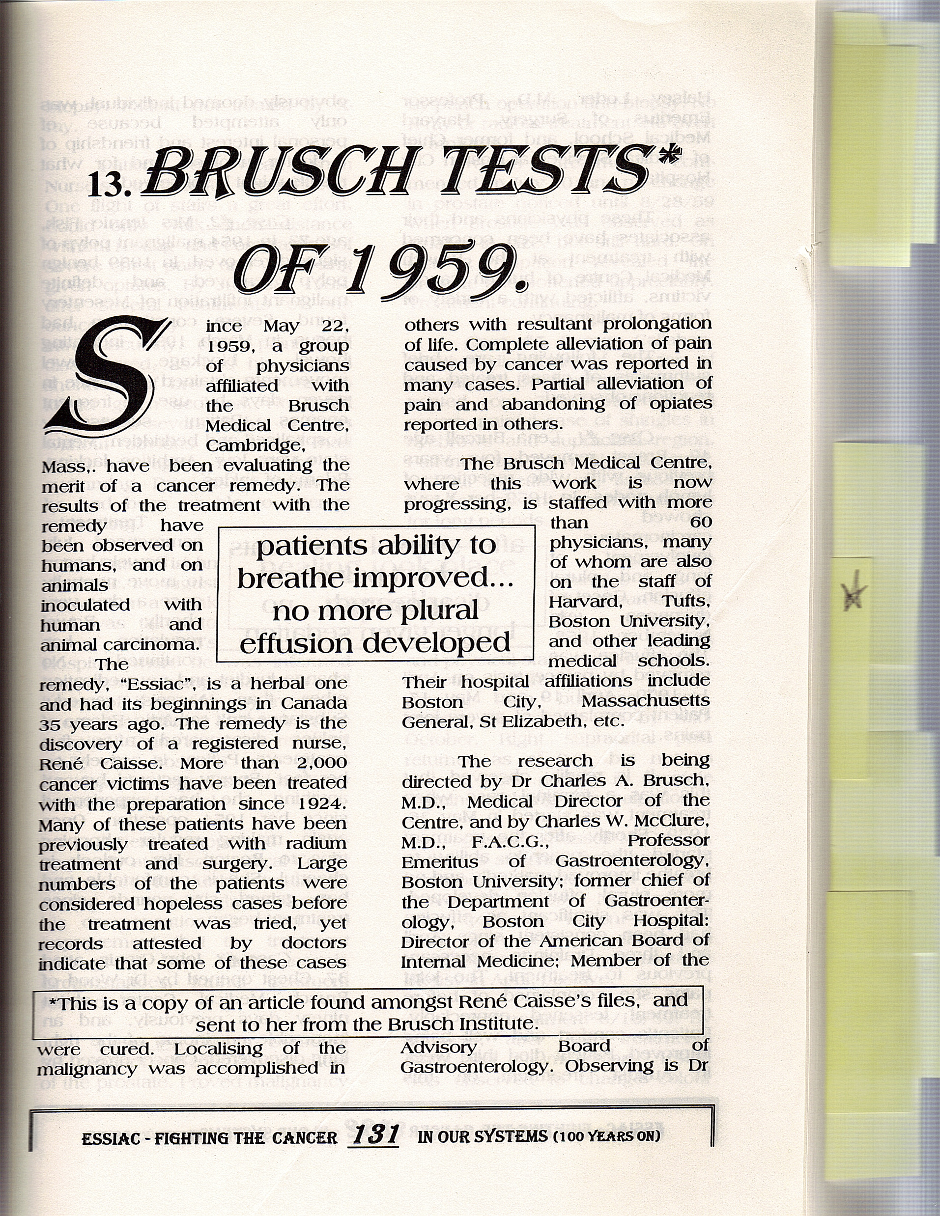 In 1959, Rene Caisse began treating terminally ill patients at the Brusch Medical Center in Cambridge, Massachusetts while supervising no less than 18 doctors. Dr. Charles Brusch, not only operated his own medical research center, he was also the personal physician of President John F. Kennedy. Dr. Brusch was a leading activist and proponent of natural medicine at a time when main street medicine didn’t know how to cope with “thinking outside the box.”