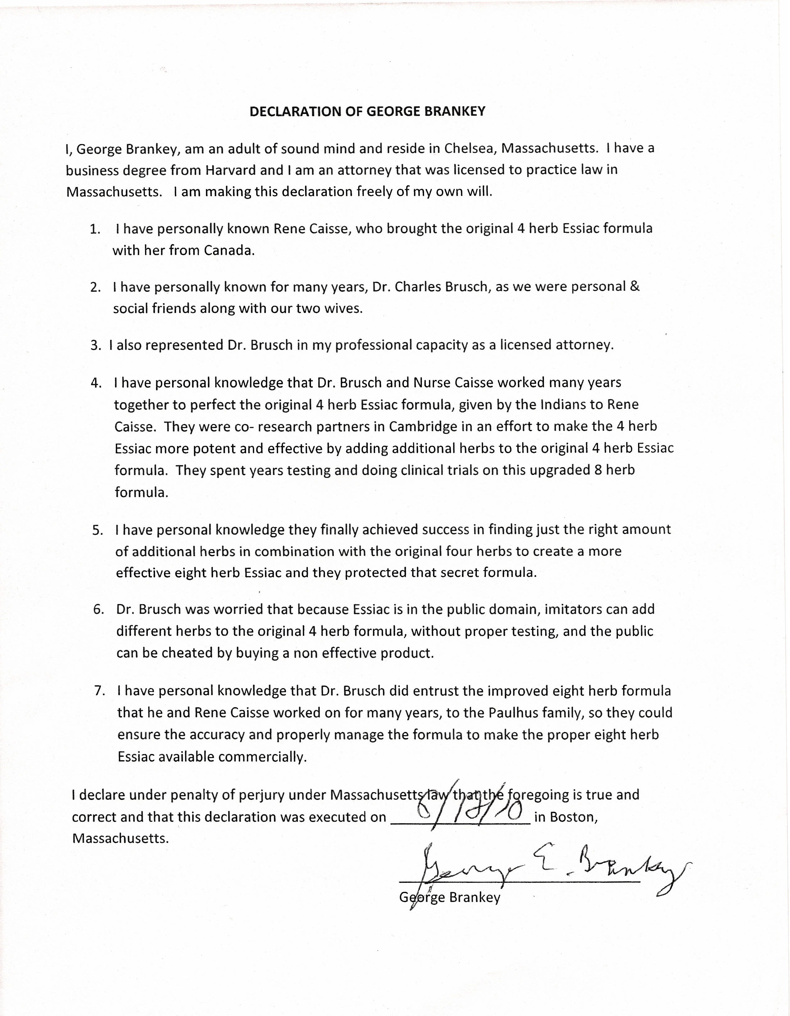 George Brankey (Dr. Brusch's Attorney) confirms the success of the Eight Herb Essiac Formula and Dr. Brusch passed this recipe to the Paulhus Family